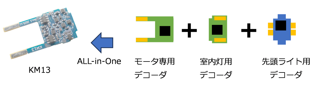 年末に、KATOのフレンドリ車両をDCC化するためのデコーダ KM13を発売する計画で、準備を進めています。非サウンドで、従来製品に対して機能をオールインワンしたタイプのDCCデコーダです。