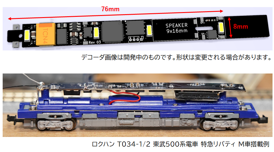 • Zゲージ車両に搭載可能な76x9mmの超小型サイズ。デコーダ基板形状、ネジ穴位置、集電バネ固定箇所をロクハン製Zゲージ車両に最適化。ロクハン製車両への本サウンドデコーダの搭載・取り付けが容易