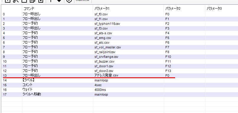 このCSVは、起動時にコールする必要があります。そこで、main.csvでcall(フロー呼び出し)してあげます。このサウンドフローではファンクション操作は一切しない(見ない)ので、ファンクション番号は何を与えても何も起きないダミー扱いとなりますが、ここではF0として配置しました。