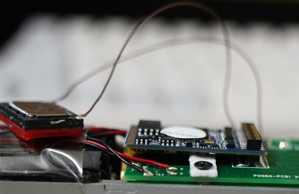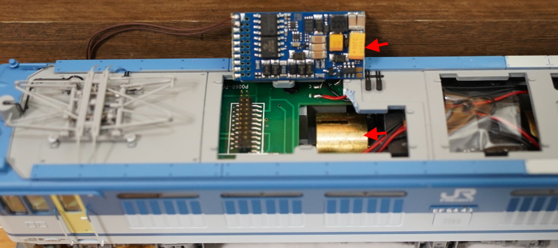LokSound5 MTC21を差し込むと、なんとフライホイールに干渉。タンタルコンデンサの高さが高いようで、絶妙にアウトでした。1mm程度余裕があればセーフでした。