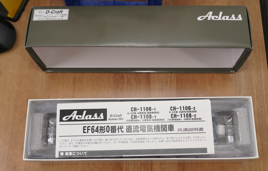 今回は、ディープランニングさんの通販で「DPCH-1108-1JR-CU アクラスEF64カスタマイズ製品」を購入しています。市場在庫としては、2023年4月現在、あとはIMONさんにもあるかと思います。箱には以下のように入っています。