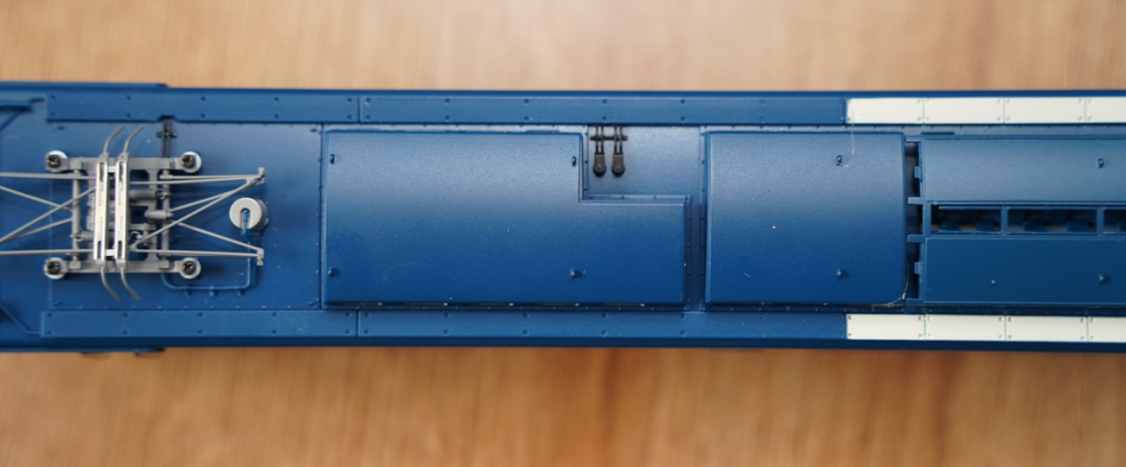 アクラスEF64では、屋根の凸の部分は、全て外せるようになっています。デコーダ部分も取り外しができますが、サウンドデコーダを取り付けると以下のように、当たってしまう箇所が出ます。そこで、見た目の影響を与えない範囲で、超音波カッターでキリトリを行いました。切り取ることで、デコーダの取り外しがしやすくなります。