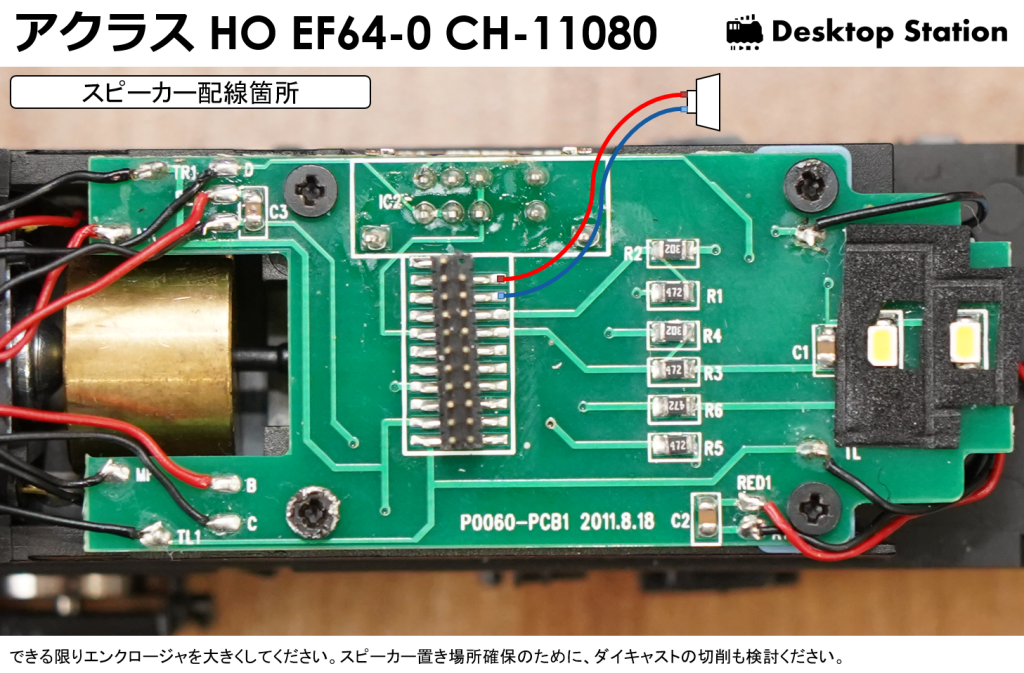 ヘッドライト・テールライト以外にはAUX1,AUX2が配線されています。スピーカーやトマランコンデンサ等は考慮していない状況なので、ピンから引き出す必要があります。スピーカーの配線箇所を図示します。ボディには、スピーカーを入れる隙間がほとんどないため、加工が必須です。音量をしっかり出すためには、ダイキャストを切削することがもっとも望ましいですが、ハードルが高いところです。