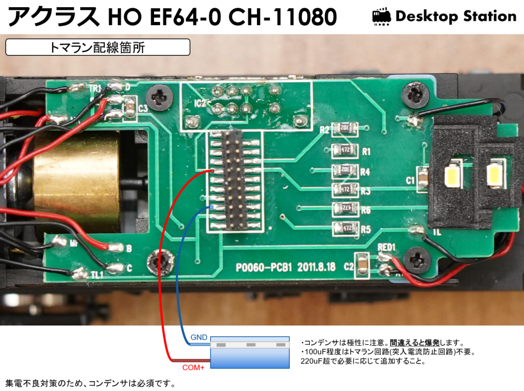 次にトマランコンデンサの配線箇所を図示します。トマランコンデンサなしで動かしたところ、動くには動きますが、音が途切れたりするなど、不安定な状態になりやすいです。220uFくらいあれば問題ないと思います。