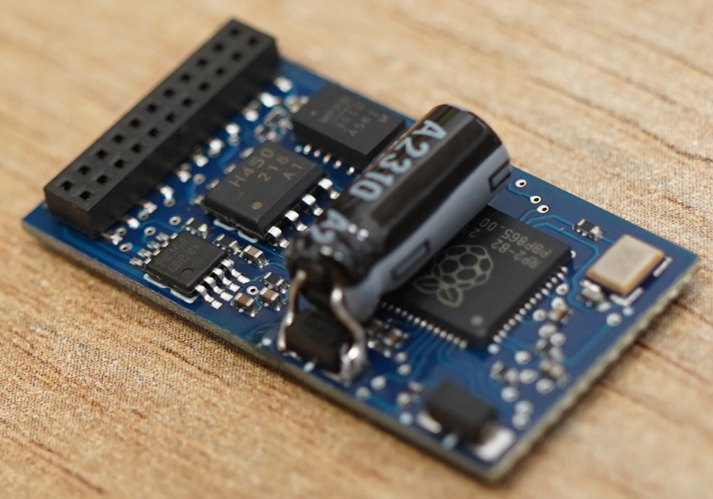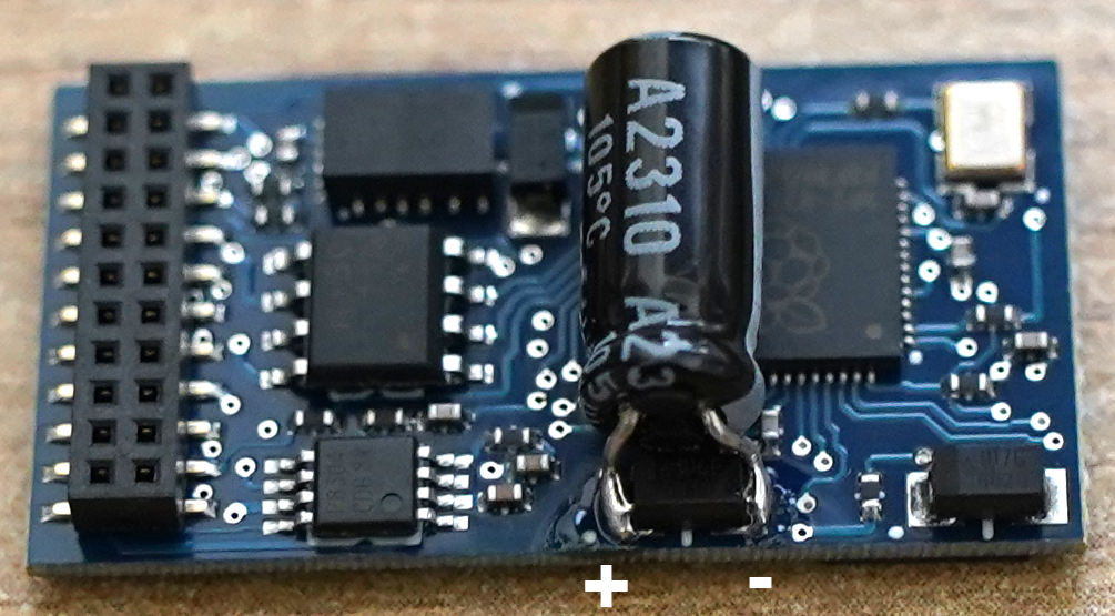 デコーダだけを取り外します。E353系サウンドデータを書き込んだSmileSoundに交換すれば、作業は完了・・・と思いきや、実は落とし穴があります。SmileSoundは、使用している半導体の仕様上、消費電力が大きいため、外付けのコンデンサが必須です。LokSoundでは必要がない場合も多いので(実際問題はあったほうがいいです)、つけてない人も多いと思います。