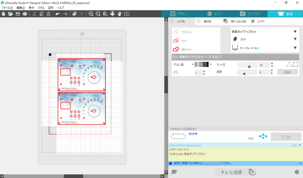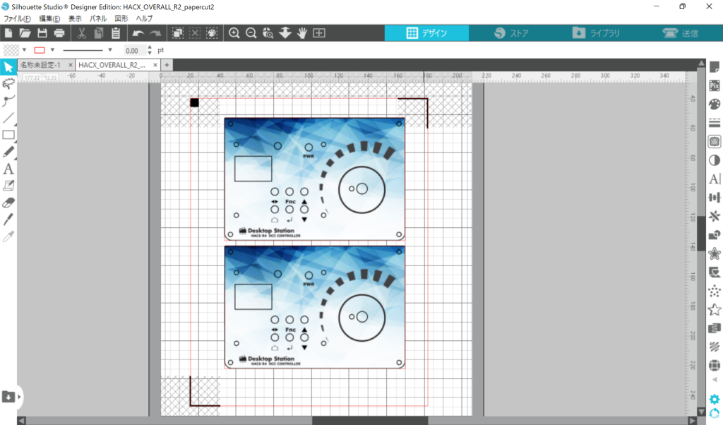 データは、アクリルパネル設計をFreeCADで行ったので、そのデータからInkscapeにsvg形式で2次元化して出力し、Inkscapeでデザインした後に、シルエットスタジオ(追加料金払って有償版に変更)に取り込んで、トンボを付けて印刷し、カットしてます。