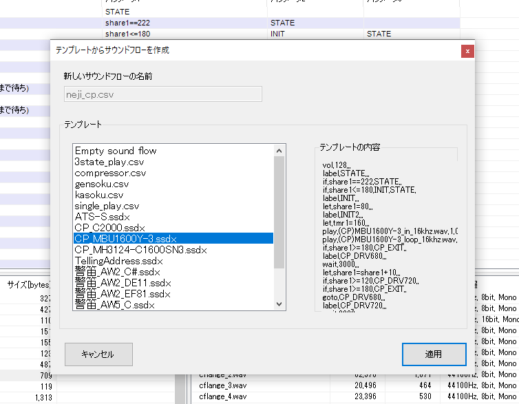 テンプレートは随時拡充します。ここではCPを違う音に差し替えてみます。MBU1600-Y3を選択して適用ボタンを押します。このCPは、比較的最近の関東私鉄でよく使われる音になります。