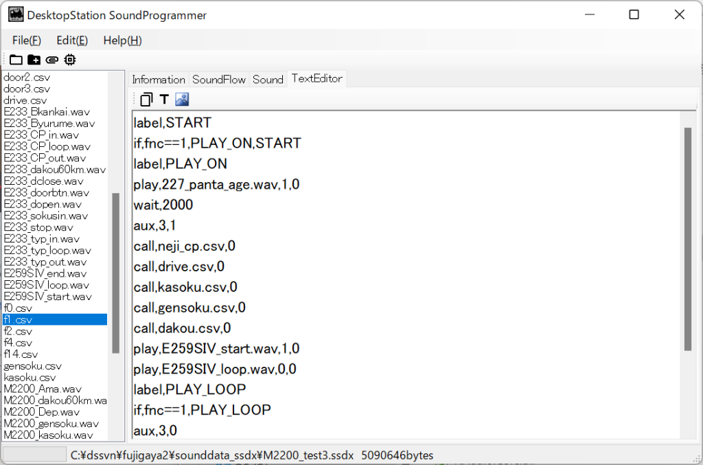 全てCSV記述のプログラムですので、音源を編集して作ったWAVファイルと、CSVを用意すれば、自由にサウンドデコーダの動作を変更できます。サウンドデータ作成ツールとして、DSSPを開発中です。