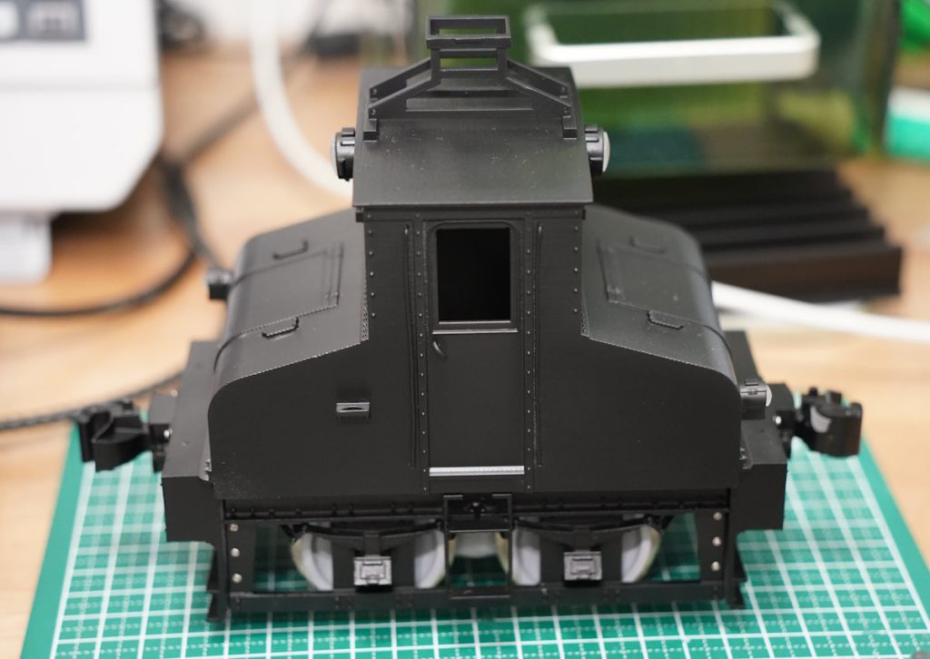 車輪を塗るだけで、外からの見た目も結構よくなります。黒く塗った方が使い込んだ感じで良いのかもですが、新品の車輪っぽくサーフェーサーの色のままにしてみました。