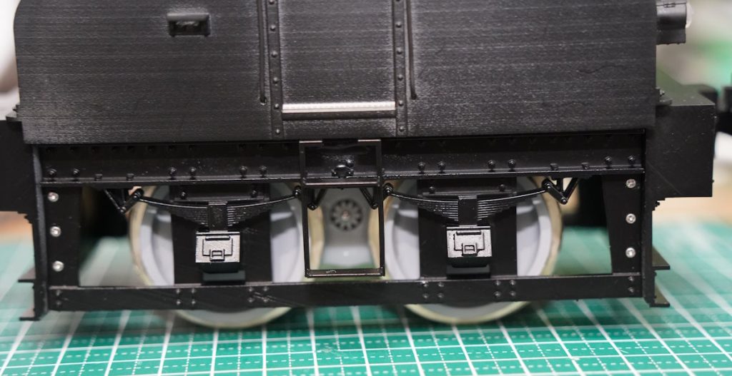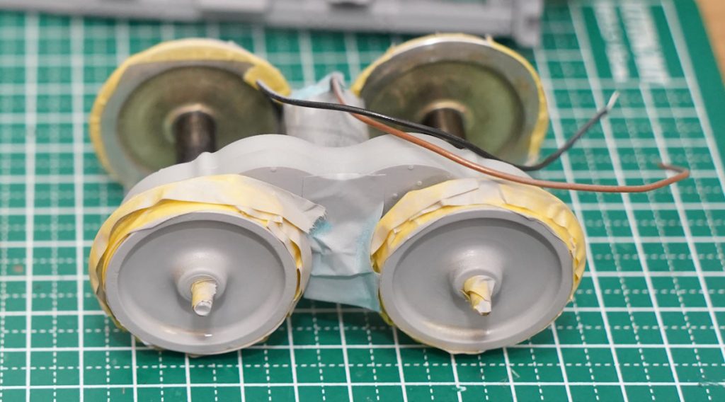 サーフェーサーで吹いたので、黒色に塗装をしていきます。その前に、台車の車輪が金属でテカテカなので、塗装することにしました。マスキングテープで、塗装してはいけない部分(集電部分とか)を保護して、塗装します。塗り方は、金属プライマー→サーフェーサーの順です。プライマーを先に吹かないと、サーフェーサーがちゃんと金属に定着しないのでご注意を。