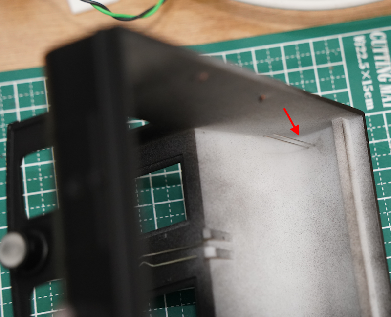 LEDも装着してます。使ったのは、秋月電子で買える3mmΦの砲弾型LED。赤色(3mm赤色LED 640nm OSDR3133A)と電球色(3mmウォームホワイト色LED OSM54L3E32B)です。