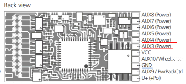 AUX3とAUX4は、基本的にロジック出力です。ただし、LokSound5 の基板上に置かれているパッド(MTC21やNext18から出ているものではない方)では、パワー出力になっていたりします。これはLokSound5 の基板内に、パワー出力に変換する回路が搭載されているためであり、MTC21やNext18経由で使えるAUX3,4は、ロジック出力です。