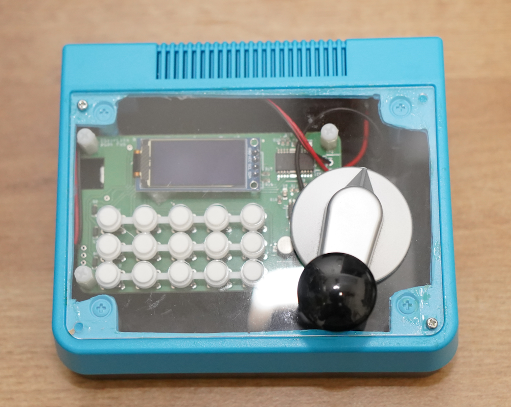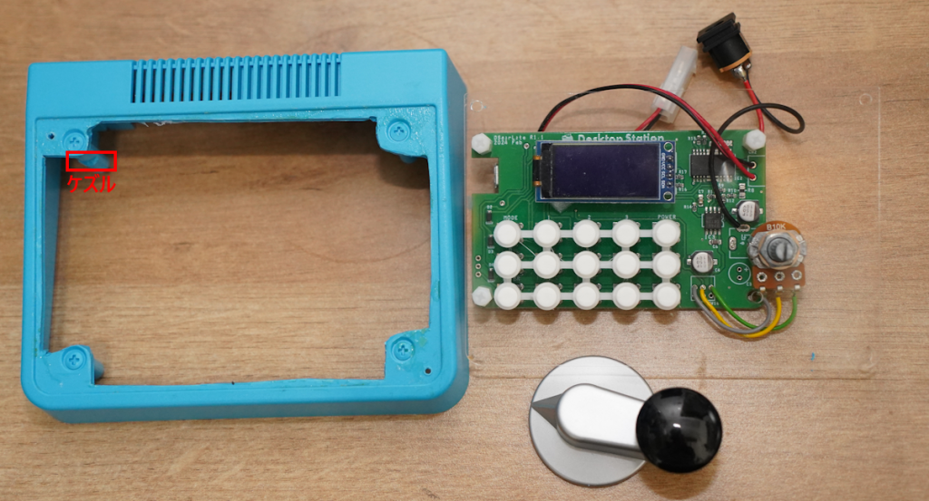 アクリルパネルの位置をミスってしまい、筐体の一部に接触するので、超音波カッターなどで削る必要があります。量産時は調整して対策します。