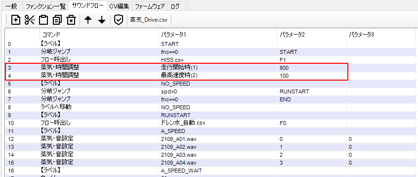 蒸気・時間調整(stmsコマンド)のパラメータ2に数値を入れていただくことで、ブラスト音の鳴る時間間隔が変わります。ミリ秒で設定するので、走行開始時が800msなら、走り出しの低速は0.8秒の間隔で音が鳴ります。速度を上げると徐々に短くなり、最高速度時が100msなら、最高速度時に0.1秒の間隔でブラスト音が鳴ります。