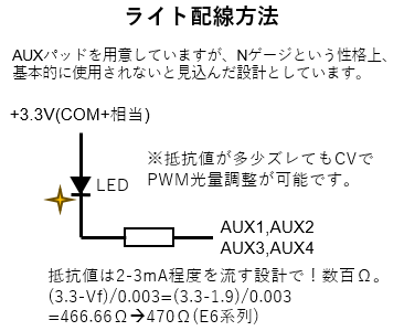 AUX1-4もパッドを用意していますが、3.3V専用としています(POWER出力用のICスペースもなかった)。Nゲージでは、テールライトをつけることはあまりないとのことなので、殆どの方は使用しないと思いますが、使う場合は以下のように配線してください。