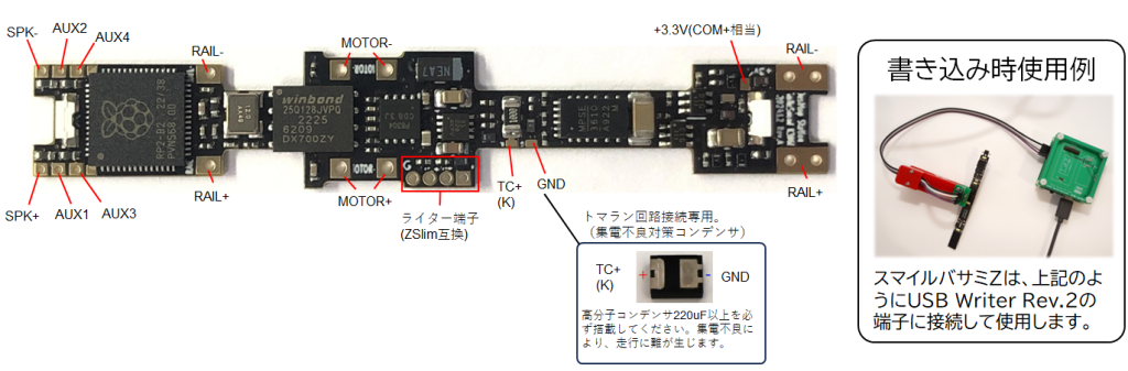 なお、本製品は、デコーダというより車両側のスピーカー・コンデンサ搭載スペースに大きな課題があり、スピーカー・コンデンサ部品搭載空間確保のためにダイキャストを削る等の加工がMustです。DCCサウンドデコーダ搭載を日々行っている猛者からも難易度の高さを理由にデバッグ協力を辞退されるようなデコーダにもなっています。