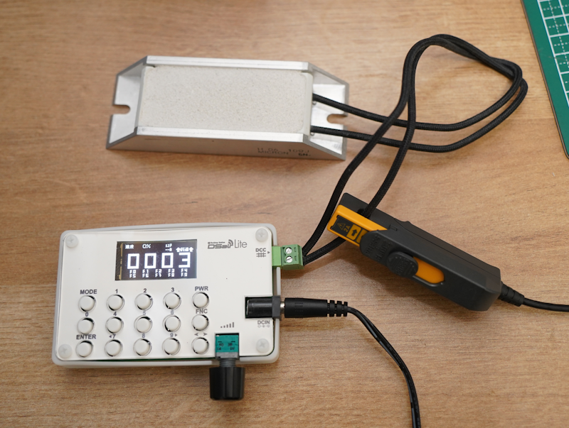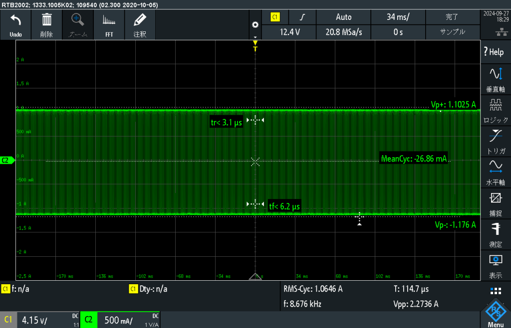 10Ωのセメント抵抗を使って電流を流したときの電流は以下の通りです。純粋なR成分なのできれいにDCCパルスと同じ周波数成分の電流波形がでてます。帯域は100kHz程度と低めですが、DCCパルスの帯域はkHzオーダーなので全く問題ないですね!