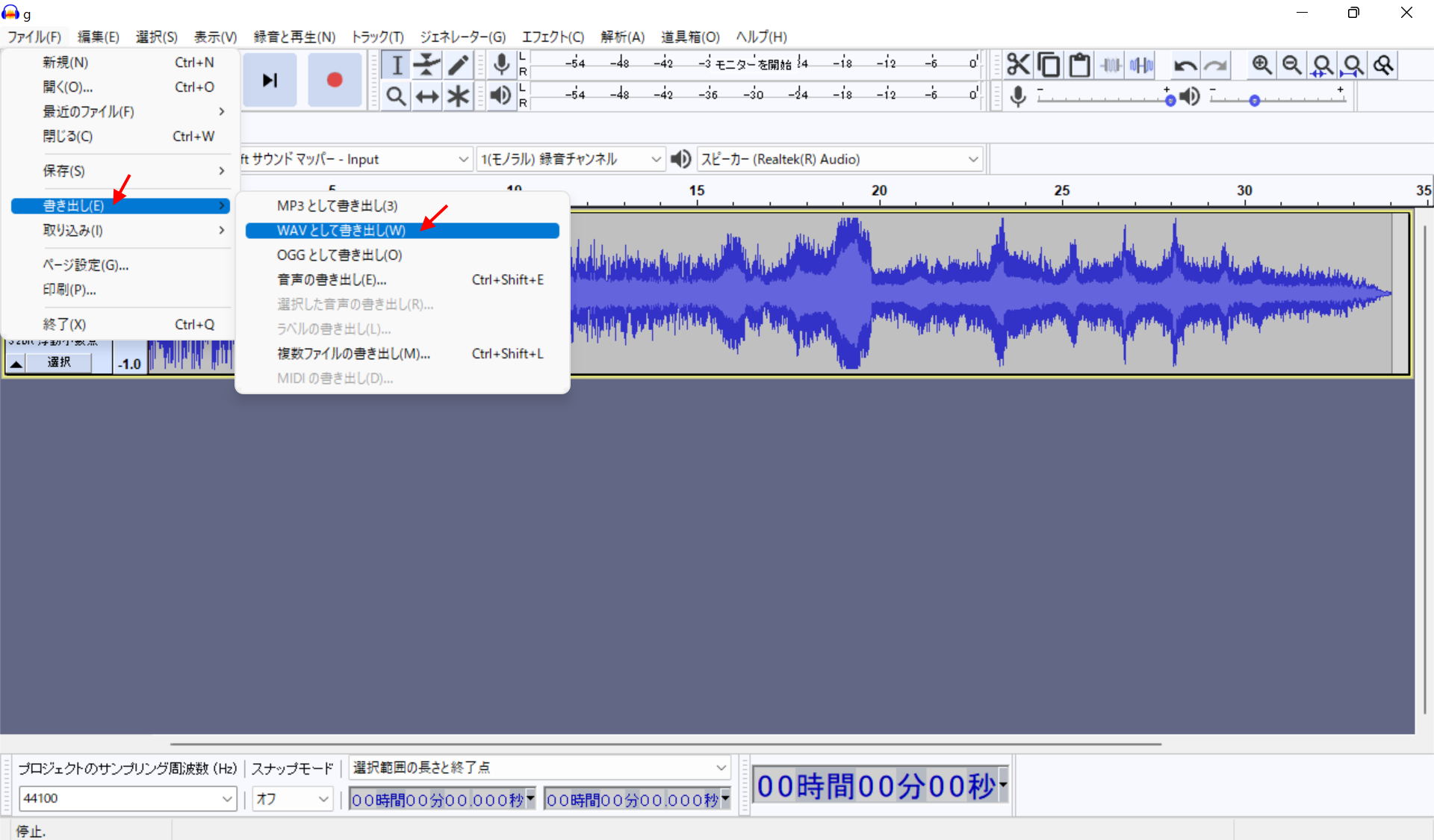 あらかじめ、変換元のファイルをAudacityで開いておいた後、ファイルメニューから、書き出し→WAVとして書き出し を選びます。