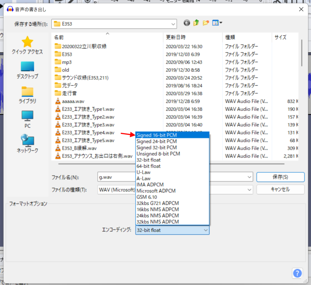 ファイルのダイアログが出たら、エンコーディングを「Signed 16-bit PCM」にします。あとは、お好きなファイル名を指定して、保存ボタンを押すと、16bit signedのWAVファイルが書き出しされます。