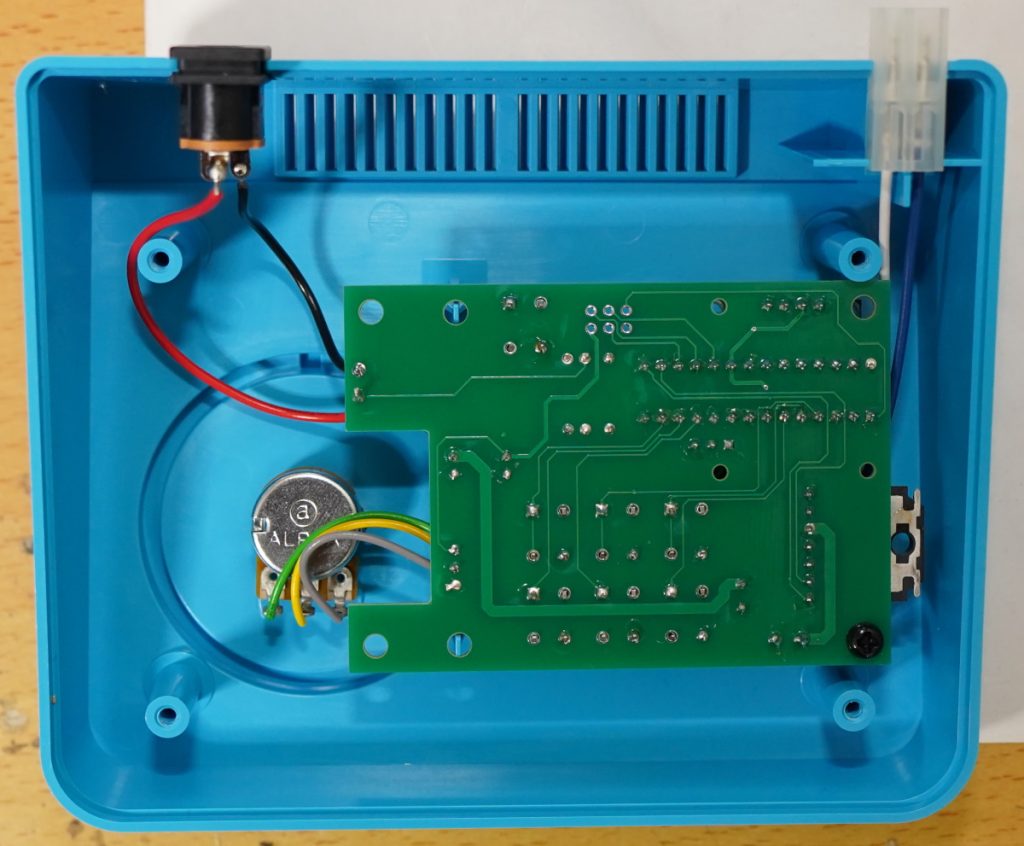 基板をケースに装着します。このとき、右下に黒いスペーサを無理やり入れてます。これは、もともとの基板ではスイッチがケースとの固定の土台を兼用していましたが、今回はそのスイッチは使用しないので、ケースと基板の間がスカスカで、固定できていない状態になってしまいます。そこで、黒いスペーサを挟んで、調整してあげました。キットには、このスペーサを付属させるつもりです。