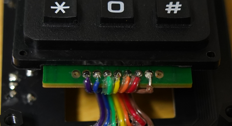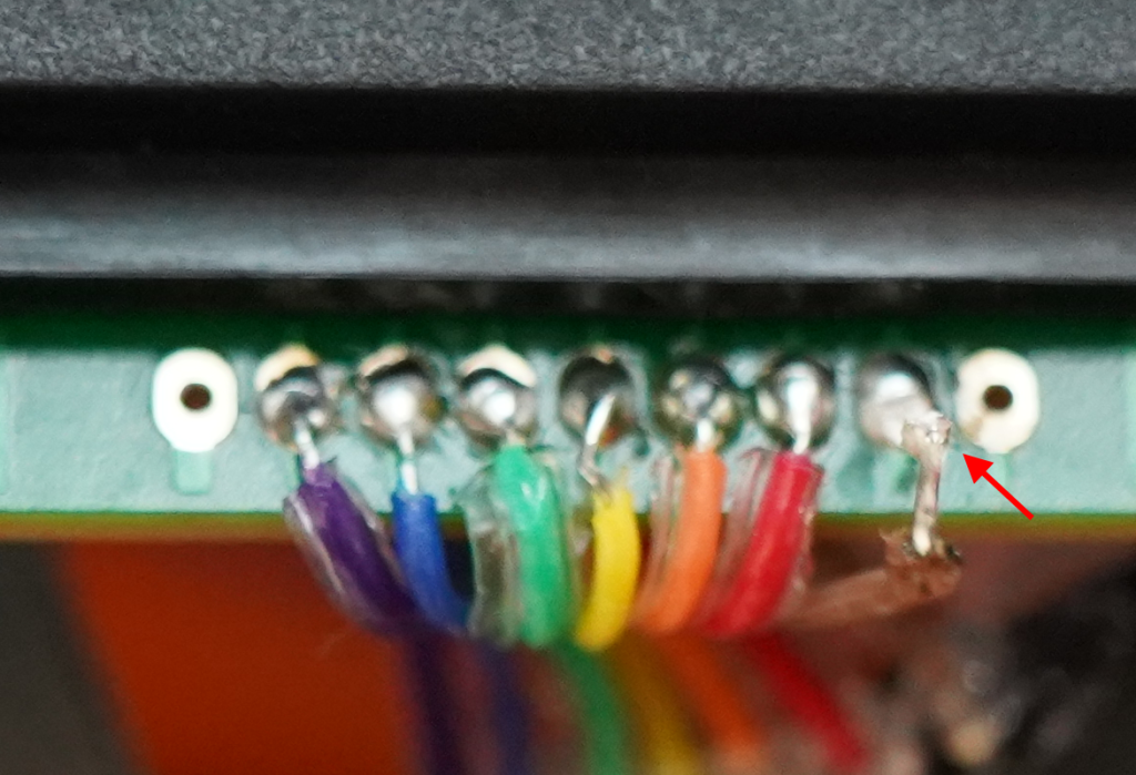 作業をしていると、どうしても無意識にキーパッドと基板間を折り曲げてしまいます。その結果、電線がはがれる場合があります。最悪はパッドがもげてしまいます。対策はグルーガンを使うか、付属のリボンケーブルではなく、細くて折り曲げに強い線に交換する事です。