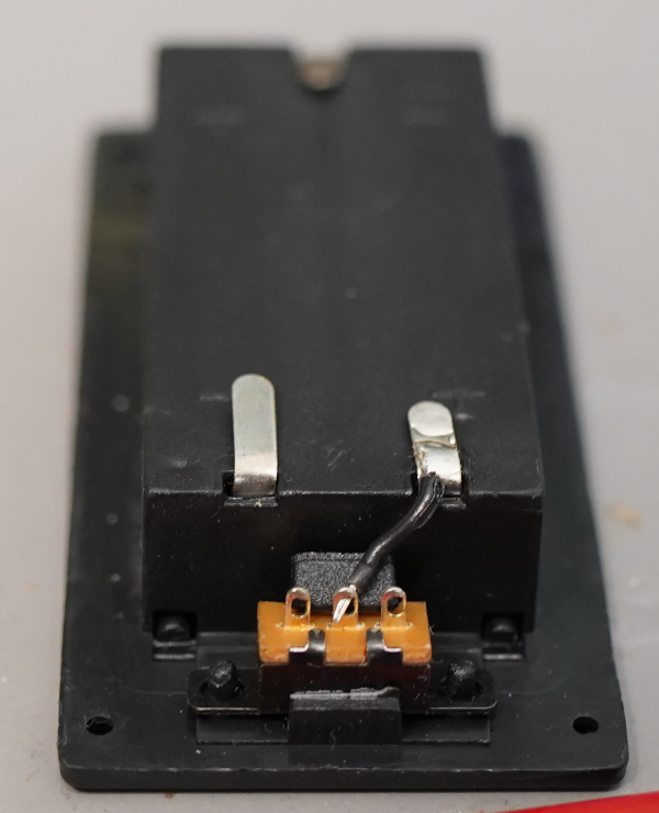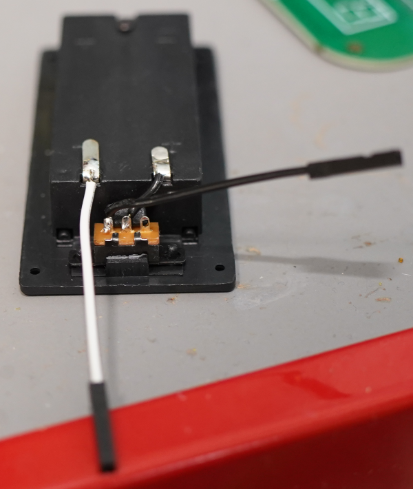 電池ボックスに電線をはんだ付けしますが、折り曲げていると簡単にはがれやすいので要注意です。こちらもグルーガンで強化しておくと良いかもです。配線も、適度に引き回して、テンションが掛からないようにすると良いです。