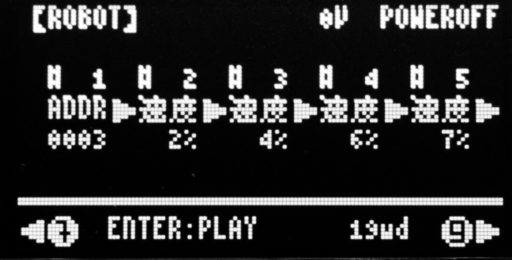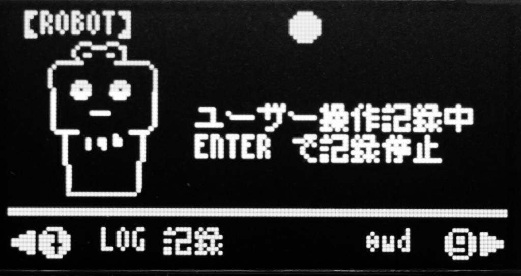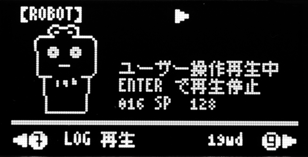 学習を止める場合には、元のロボット運転士の画面に戻ってENTERを押します。すると以下のような、記録結果が表示されます。この結果をクリアしたい場合は、FNCを押すと、初期状態に戻ります。ENTERを押すと、この記録された内容をもとに、再生を開始します。