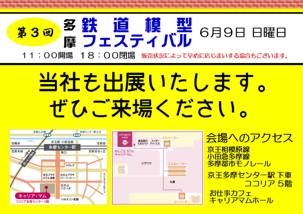 6月9日に開催の多摩鉄道模型フェスティバル(京王・小田急の多摩センター駅)に出展予定です。これまでには、豊富な在庫をご用意したいと考えております。