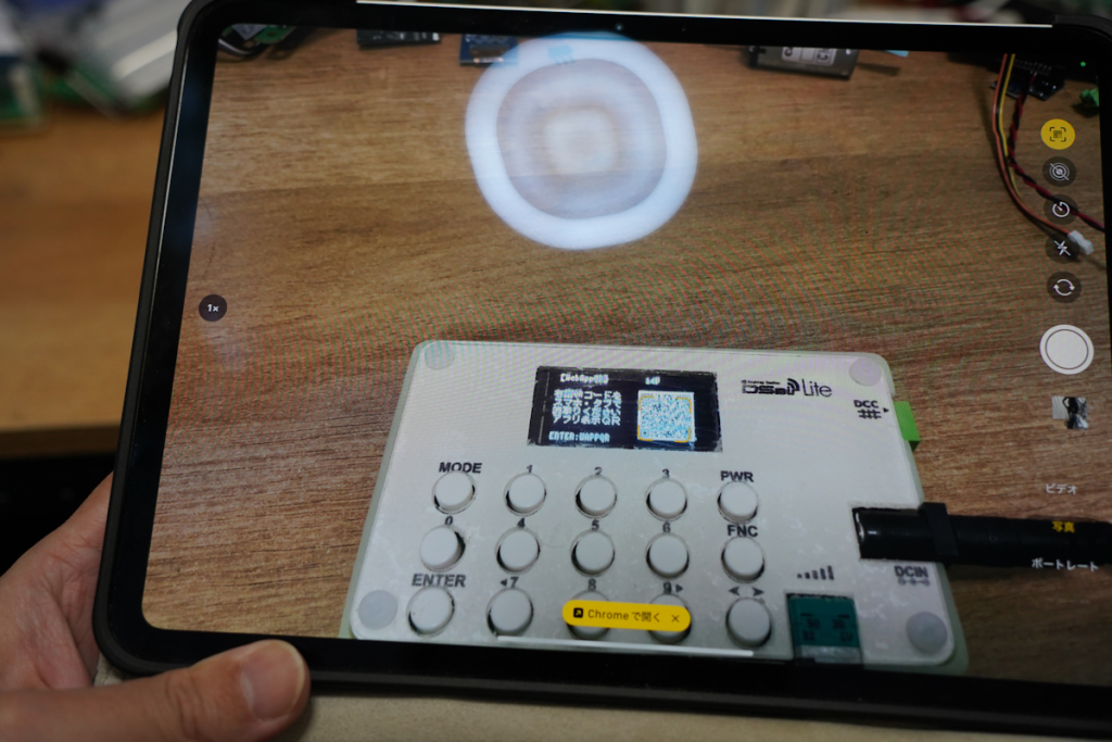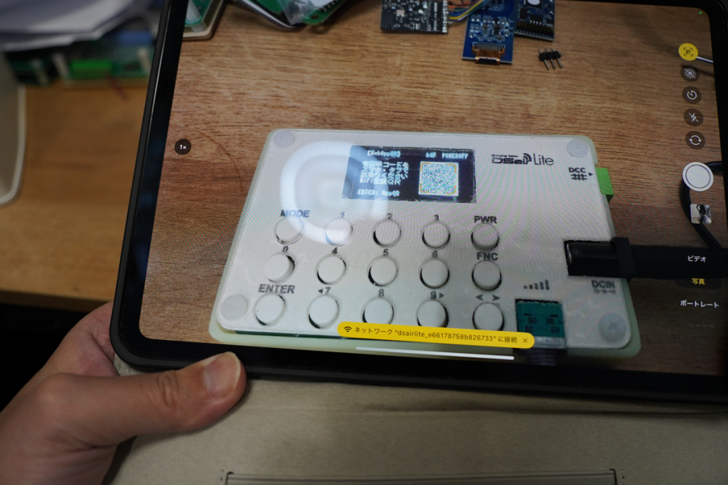 すると、DSairLiteがWiFi親機(一種のルーター・WiFiアクセスポイント)となるので、スマホをDSairLiteにつなげるためのQRコードが表示されます。iPadのカメラアプリでQRコードをスキャンして、「ネットワーク”DSairLite_*****”に接続」をタップします。すると、自動でiPadとDSairLiteの接続処理が行われます。