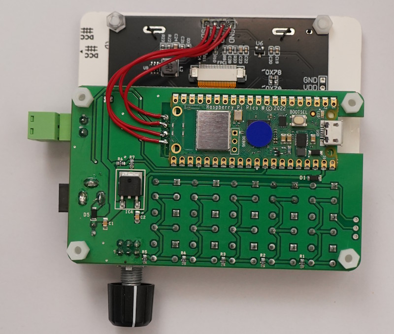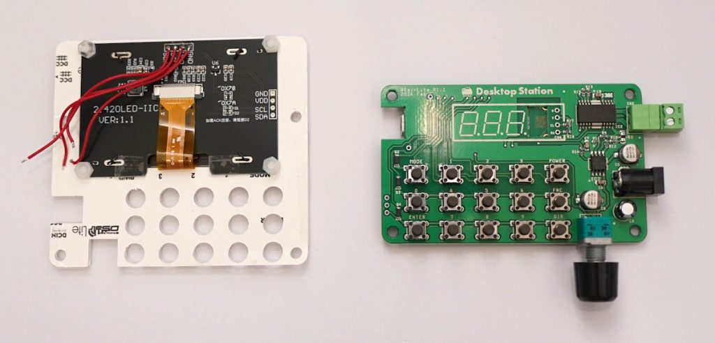 基板にコネクタをはんだ付けしたら、先程組み立てた上面のディスプレイパネルと基板をスペーサとネジで固定します。