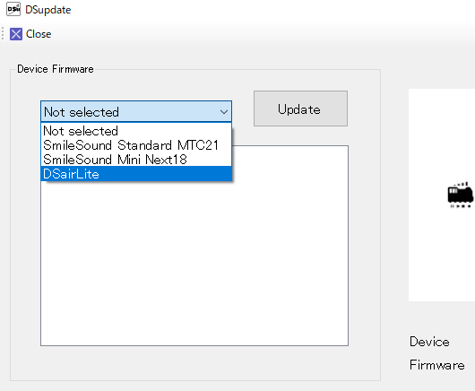一番最初のみ、手動でDSairLiteを選択してファームウェアのアップデート(書き込み)をお願いいたします。まず最初に、DSairLiteをPCに繋げたあと、DSupdateを起動すると以下のような画面が表示されます。