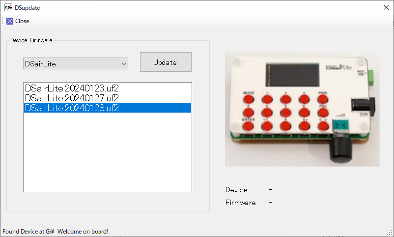 選択すると、以下の画面が表示されます。この画面が出たら、Updateボタンを押してください。自動的に、DSupdateに内蔵されている最新のファームウェアが、DSairLiteに書き込まれます。