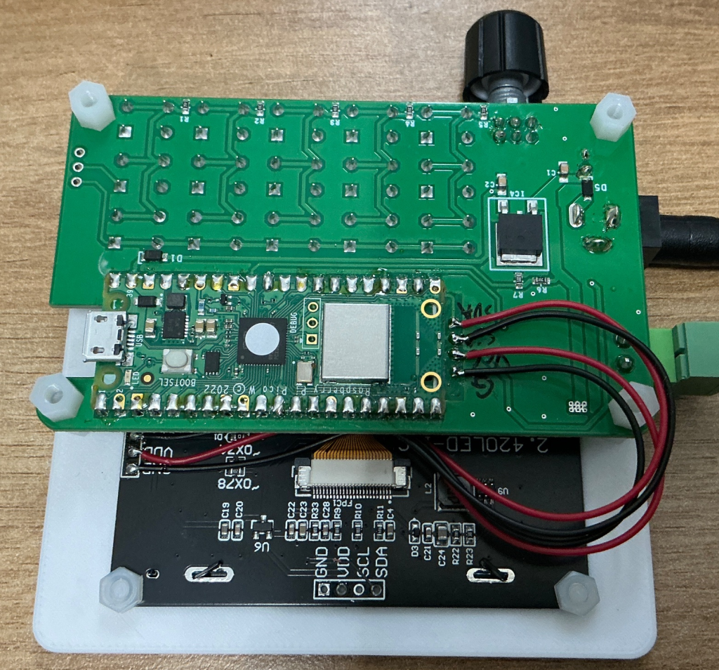 基板はDSairLiteと共通で、筐体ケースとOLED、表面のパネルを変更しています。2.42インチと大型のOLEDですが、なるべくコンパクトとなるように配置を調整しています。OLEDの配線は、別途、ケーブルではんだ付けする必要があります。OLEDは、パネルにネジ止めするため、ピンヘッダは使用できません。