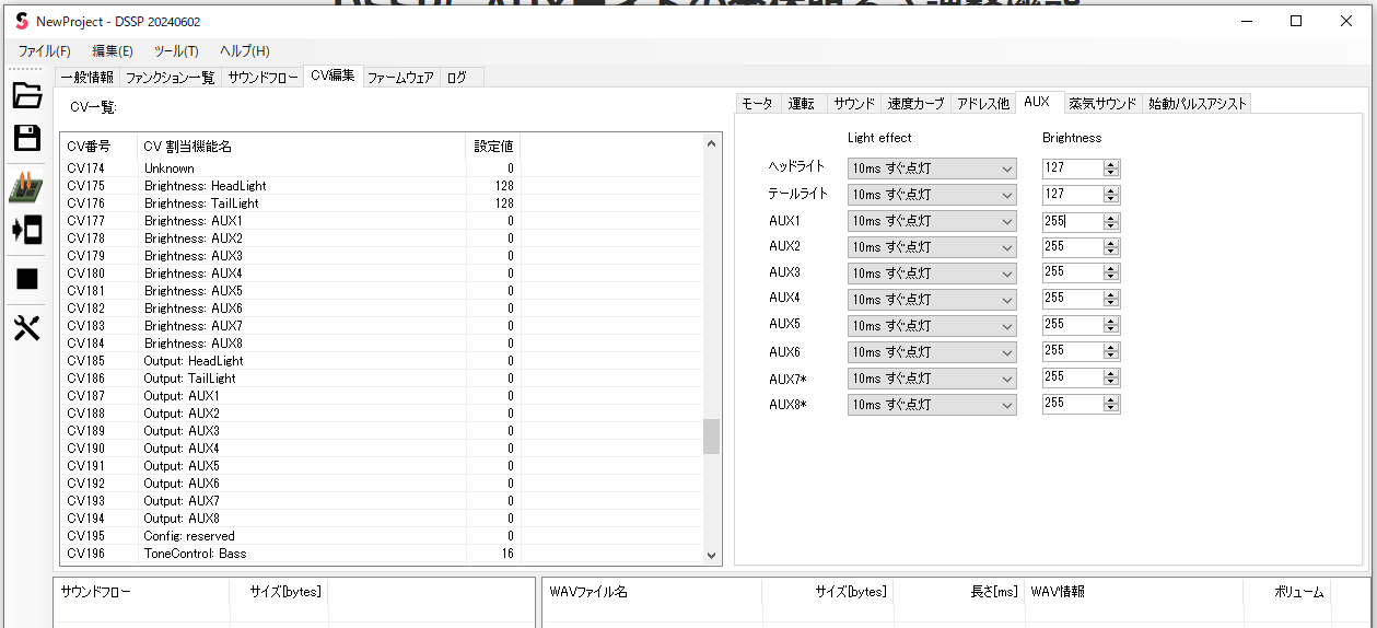 DSSPの20240602にて、AUX出力の明るさ(PWM)調整機能を追加しました。そのほか、setコマンドでcv1-cv255に書きこめないバグも修正しています。本機能を有効にするには、SmileSoundファームウェア20240602をご使用ください。