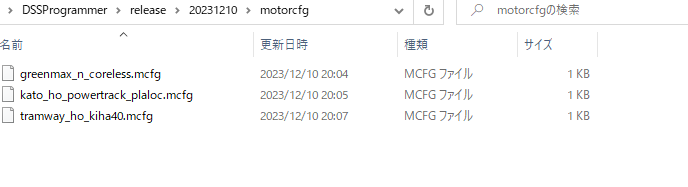 DSSPのパッケージの中にmotorcfgフォルダを追加しています。この中に、まずは三種類を入れてあります。ユーザーの皆様からの情報を元に、ここを増やしていこうと考えております。ぜひとも、データの寄贈をお願いいたします。データは、弊社のサポートメールにそのまま送っていただければ、DSSPの更新時に取り込んで反映させていただきます。