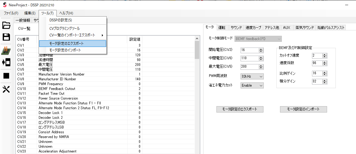 メニューのツールか、CV編集画面の中のモータタブのどちらでも、モータ固有のファイルをエクスポート・インポートできます。