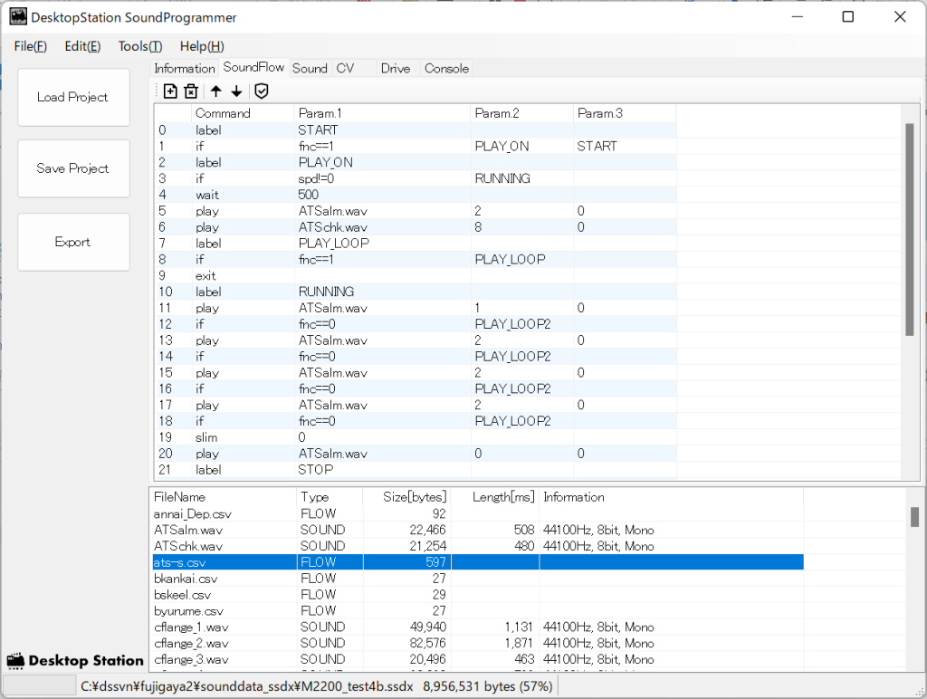 • WAVファイル(44.1kHz/22kHz/11kHzの8bit, 16bitでモノラルのもののみ)と、CSVファイル(テキストエディタでサウンドフローを作っている場合)を用意する。