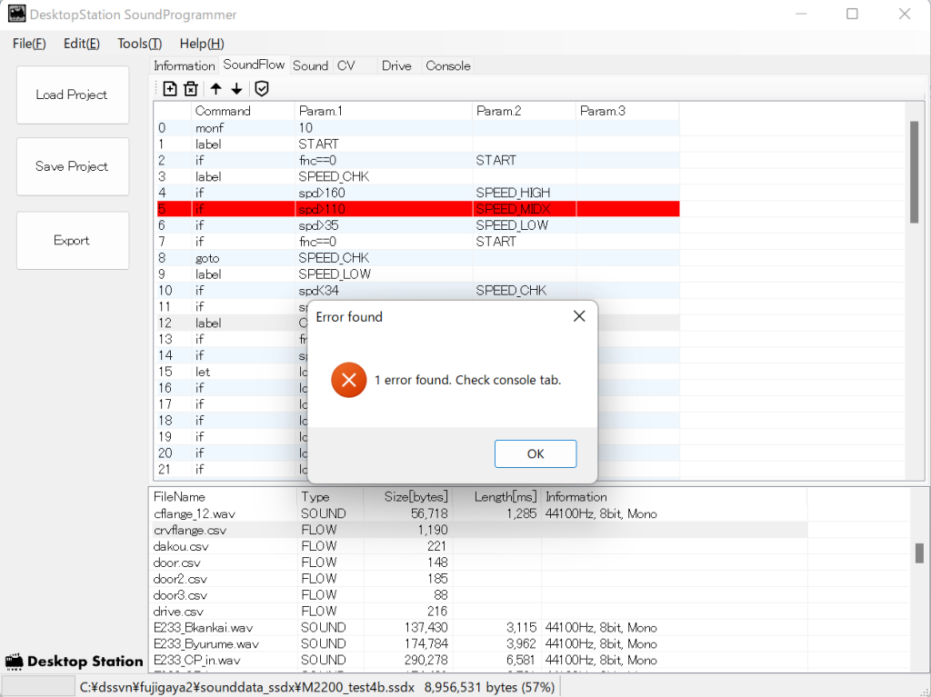 しかし、問題がある場合には、問題のある個所が赤く表示されてエラーが出ます。以下の例では、存在しないジャンプ先ラベルが記述されていることが問題になってます。これでは、正常にサウンドフローが動きませんね。