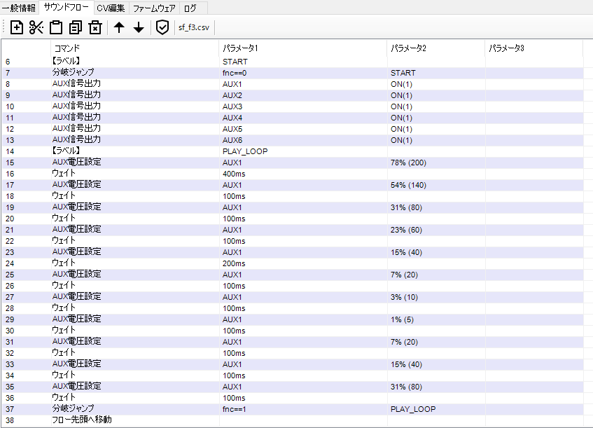AUXでは、単純なON/OFFの制御しかサウンドフローではできませんでしたが、PWM出力が可能ですので、Duty(実質な電圧調整)を行えるように、”auxs”コマンドを追加しました。