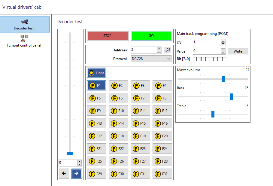 この機能は、E社の仕様とインターフェース互換としているため、LokProgrammer 5.2.5のBass・Trembleのトラックバーを使って運転中にSmileSoundの調整が可能です。