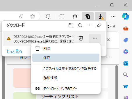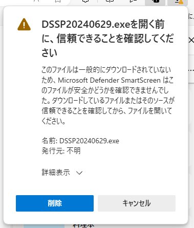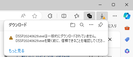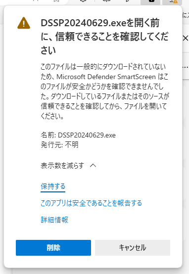 まず、DSSPをダウンロードすると、ブラウザであるMicrosoft EDGEでは以下のように警告を受けます。これは、インストーラー版が実行ファイル形式となっており、不正なランサムウェアやコンピュータウイルスの可能性があるとの警告ですが、弊社でソースコードからビルドし、ウイルスチェックを実施しており、安心してご利用いただけます。