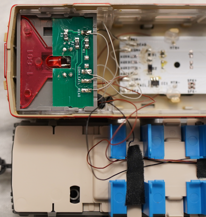 3㎜の白と赤のLEDと、狭小用に入れられる小型のLED、560Ω抵抗(2012サイズ)を実装して配線した様子です。