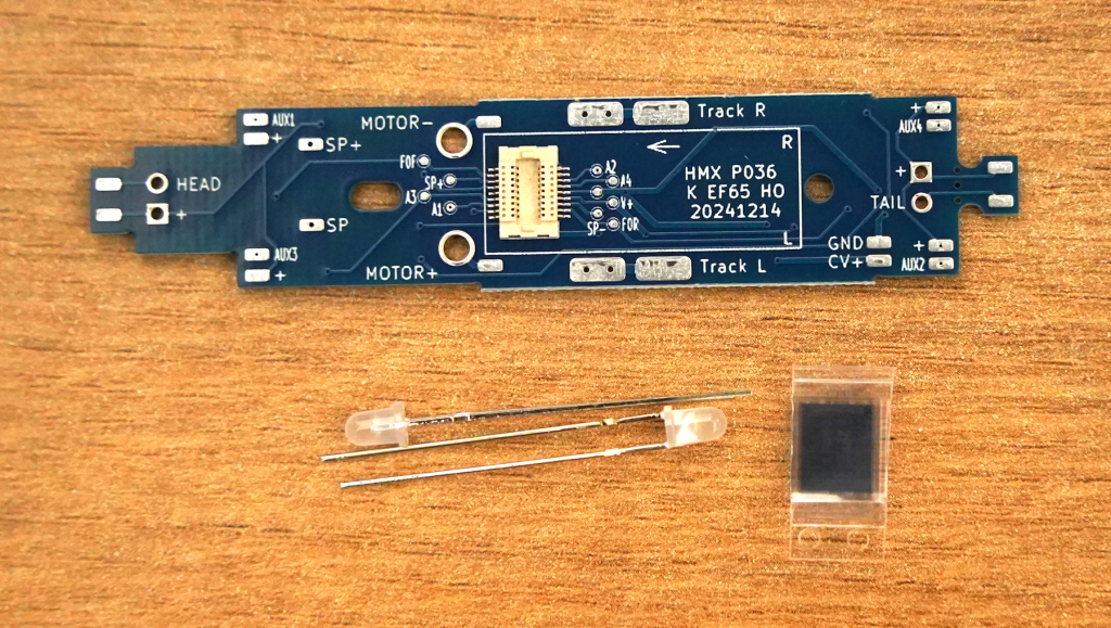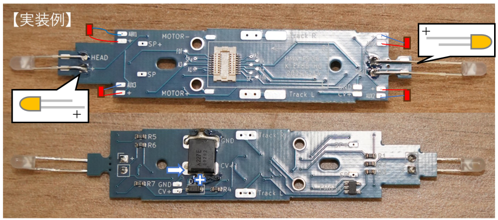 サウンドデータは入れ替え灯もサポートしてますので、四隅のテールライト4個所(AUX1,2,3,4と+の組み合わせのパッド)に、秋月電子で売っている赤色チップLED ワイヤ付 OSHR1608C1A-W25を使うと、よりカッコよくなります。抵抗はこの基板上にあるので、LEDワイヤのはんだ付けと車両への取り付けだけなのですが、細かい配線作業やライトレンズへのLEDのはめ込みはそれなりにタフなので、ここでは省略します。いろいろな方が紹介されているDE10の改造方法を参考にすると良いと思います。
