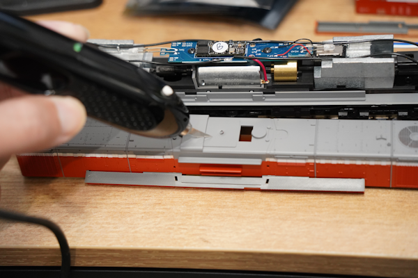 問題がなかったので、戻していきますが、デコーダがケースに当たるので、超音波カッターで邪魔なところを切り落としていきます。