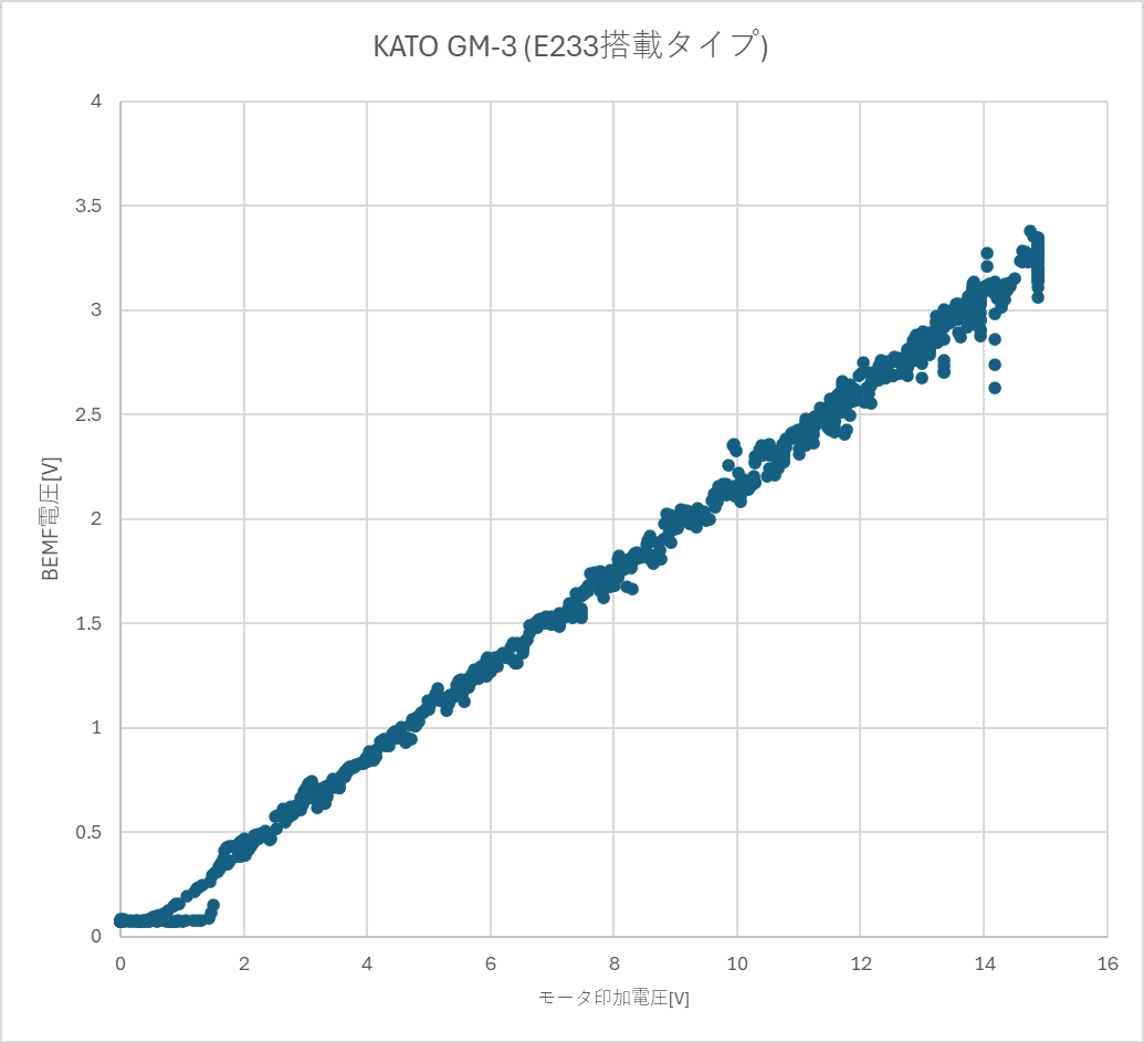 KATOのNゲージ車両で、かなり使われていたGM-3モータです。ここでは、E233に搭載されていたモータを外して特性を測定しています。低速域はBEMF検出ができない条件がありますが、それほど悪いわけではありません。高速域は振動しますが、12Vまでは大きな問題は無いと思われます。オーソドックスで定番となる鉄道模型用モータと思います。
