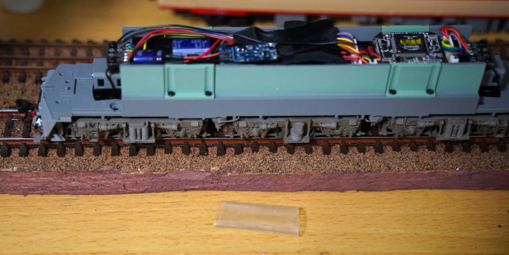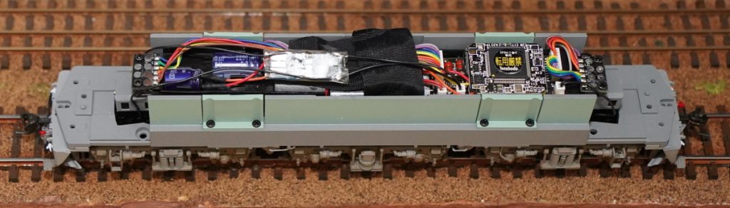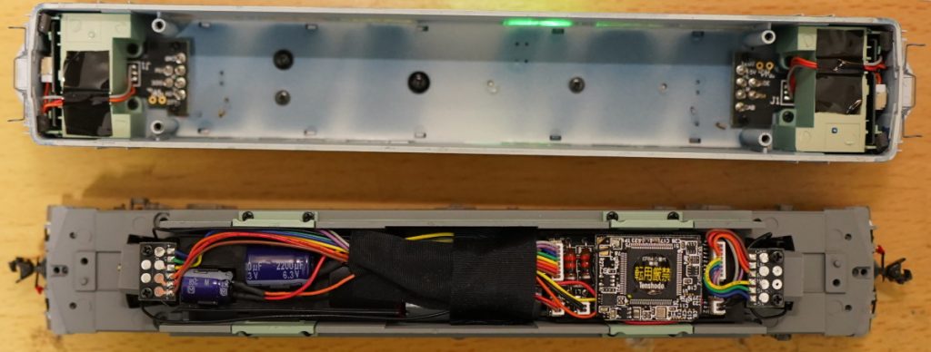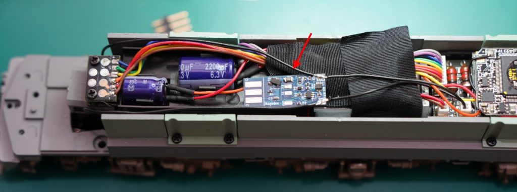 この車両はアメリカ系のデコーダであるQSI(Q.S.Industries)社のカンタムサウンドデコーダが搭載されていますが、欧州系のRailComには対応しておりません。そこで、RailComで動かすために、Nagoden製の開発中製品であるSenderモジュールを搭載してみました。