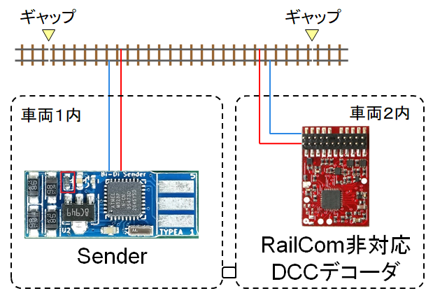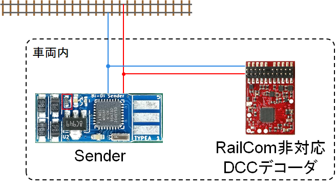 Senderというのは、RailComのデータ送信モジュールの事で、RailComに非対応のデコーダをRailComに対応することができます。以下のように、並列(パラレル)に車両に搭載してください。