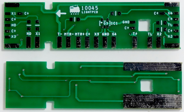 T社のHO機関車に搭載可能な、ライト基板です。T車のHO機関車の突起部分に合わせて基板を設計しています。
