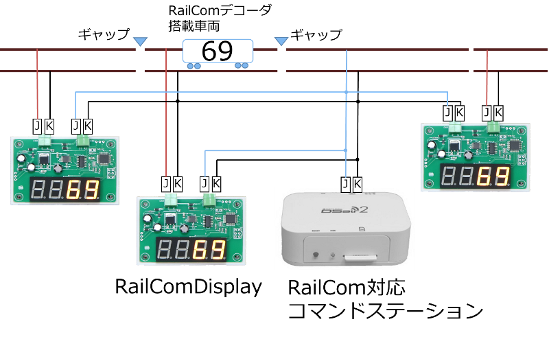 複数台、RailcomDisplayやDetectorを配置する場合には、以下のようにギャップで区切った線路ごとに、配置します。その区間にいる車両のアドレスを検知する仕組みのためです。