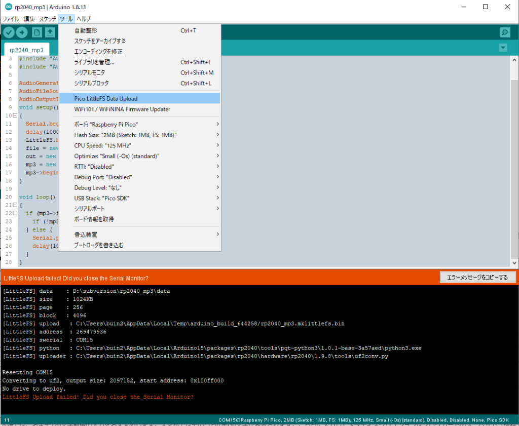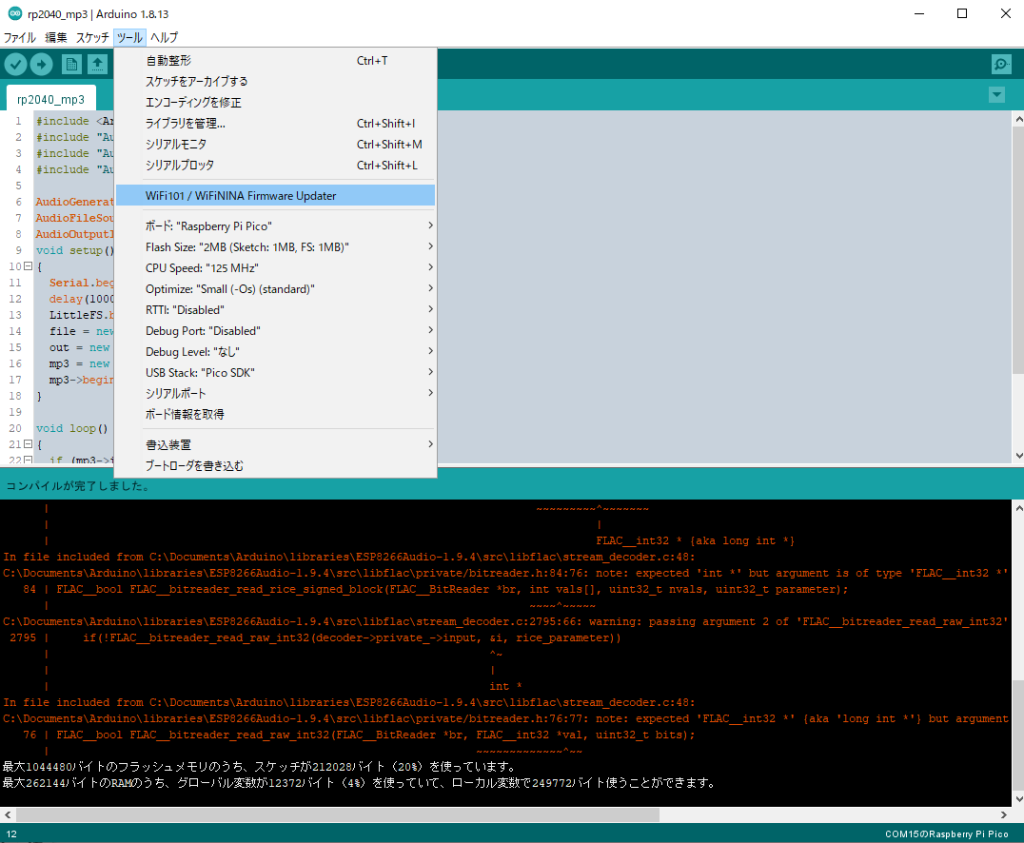 実はそのままだとSPIFFSというファイルシステム用ライブラリが無いと言われてコンパイルが通らないです。LittleFSというほとんど同じ機能を持つライブラリが、RP2040向けに移植されているので、こちらを使うようにちょっと直すのが正解です。下記は、ESP8266AudioのGithubページにある例を、LittleFS用に直しただけです。